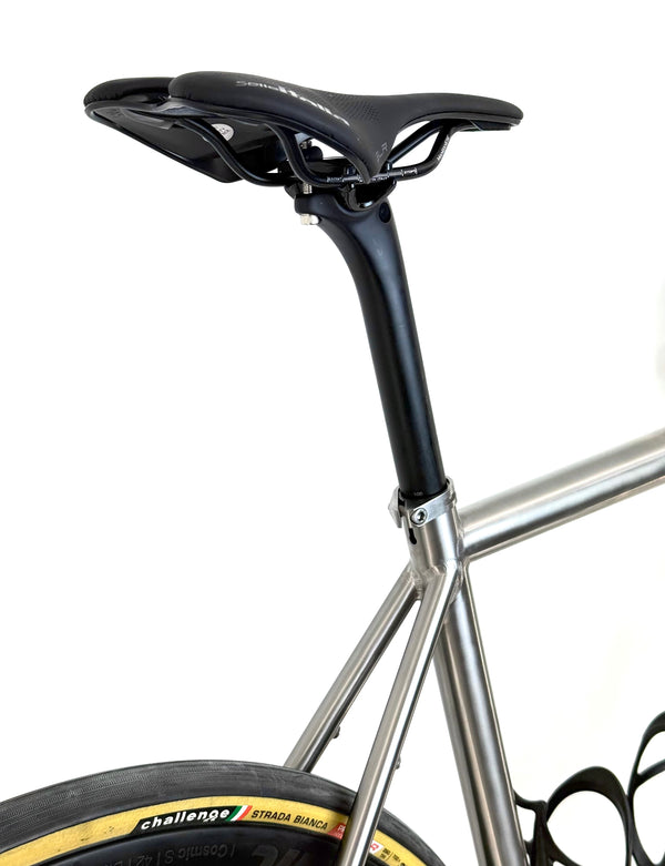 The 3AL 2.5V , grade 9 titanium frame weighs 1150±30g in size Medium (54) and the uncut forks weigh 425±15g.